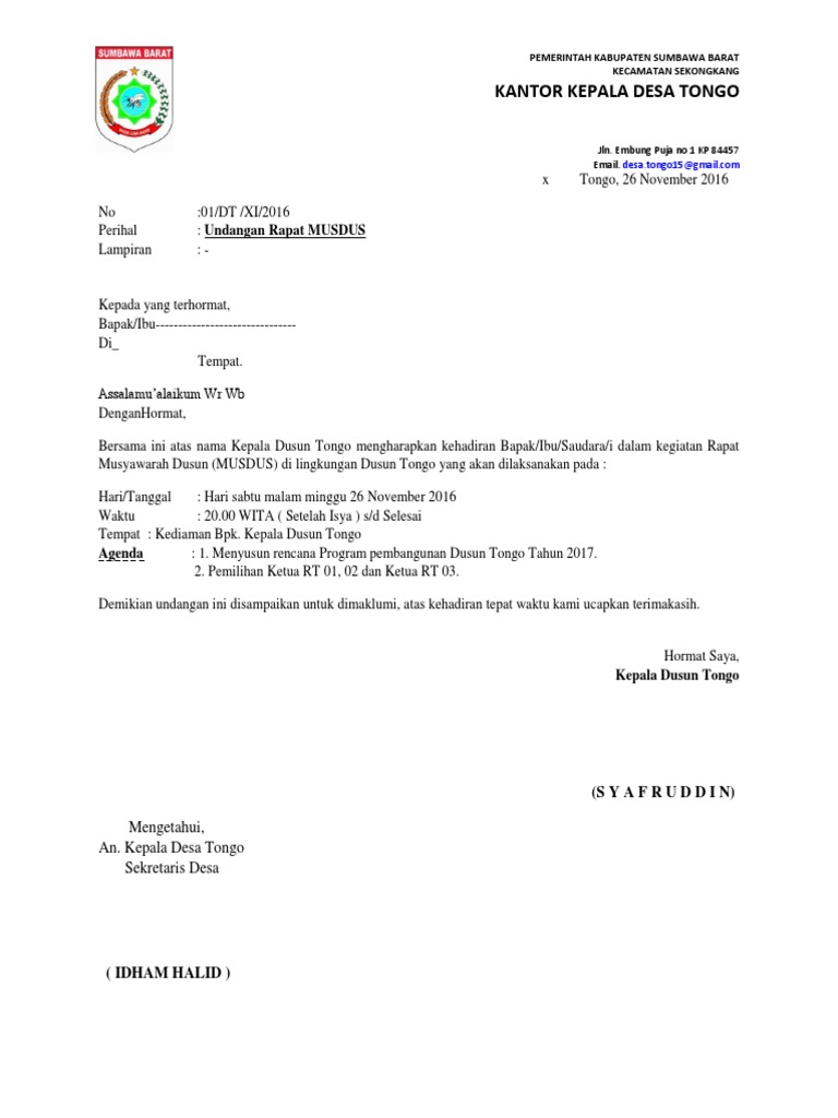 1 from Contoh surat keterangan tanah dari kepala desa. Ini adalah contoh surat undangan rapat ketua rt dan pengurusnya. Hal yang membedakan karena keduanya memiliki struktur yang berbeda dan untuk keperluan yang tidak. Tetapi sebelum itu anda harus paham dan mengerti contoh surat undangan resmi dan tidak resmi. Contoh surat undangan rapat resmi. Sekretasi desa bisa memanfaatkan perangkat lunak pengolah kata seperti biasa yaitu ms word, mengetik bagian bagian seperti dibawah ini Di sana dicantumkan data serta logo instansi. Untuk itu kami mengharapkan kehadiran seluruh bapak dan ibu perangkat desa bangun pada.
